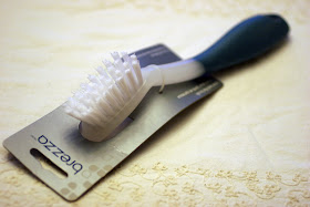 On to the giveaway! Pictured above is a brush. Purchased at Shoppers Drug Mart, just for one of you lucky folks. It has a whopping retail value of $4.99 CDN. I have a few of these brushes, and I love them. Wait - I LOVE them. Really, really, love. My favouite use for them is on my cast iron pans. The bristles are the stiffest I've ever seen, and they have a little grout cleaner semi-pointed thing on the back. Since one isn't supposed to use soap on cast iron pans, all you need to do, even after having eggs, is to run some hot water in the pan, loosen the stuck bits with the back of the brush, use the bristles to scrub off the rest, and voila! Done like dinner. I also have one in the bathroom, which is excellent for scrubbing the tub. (A tip from the archives - if you have an old enamelled iron tub like mine and are at a loss for how to really get it clean, baking soda and 5% hydrogen peroxide will get it clean. Sprinkle, spray, and leave it overnight. A quick scrub and rinse in the morning, and you're done. Promise!) So, that's item #1 which is up for grabs.